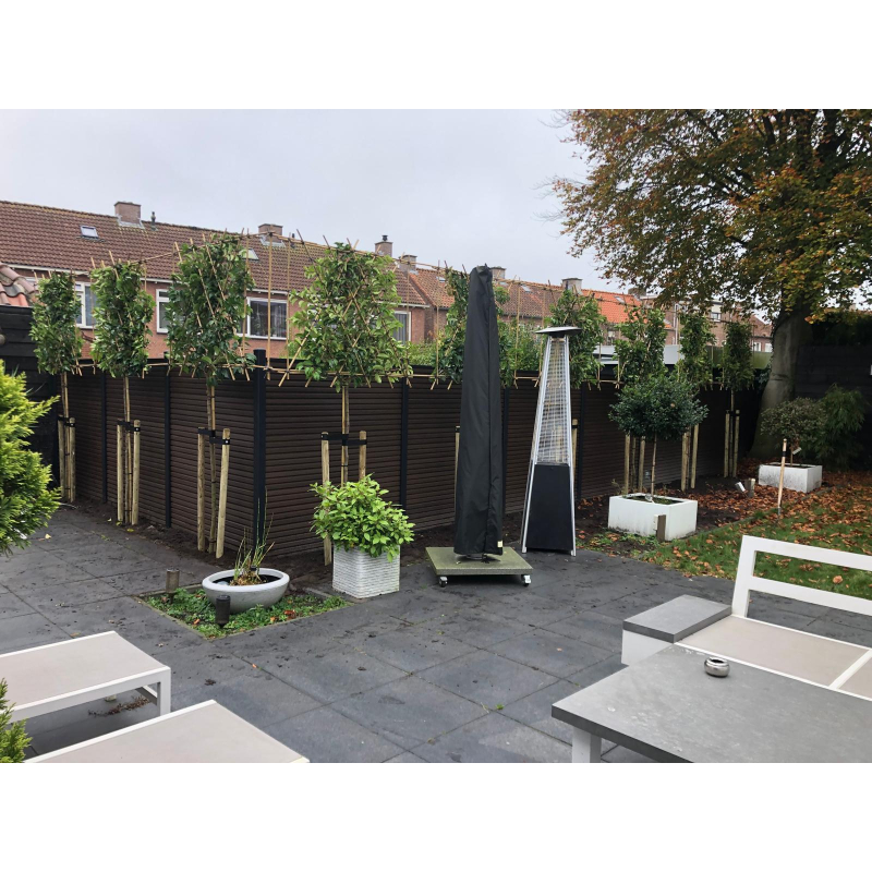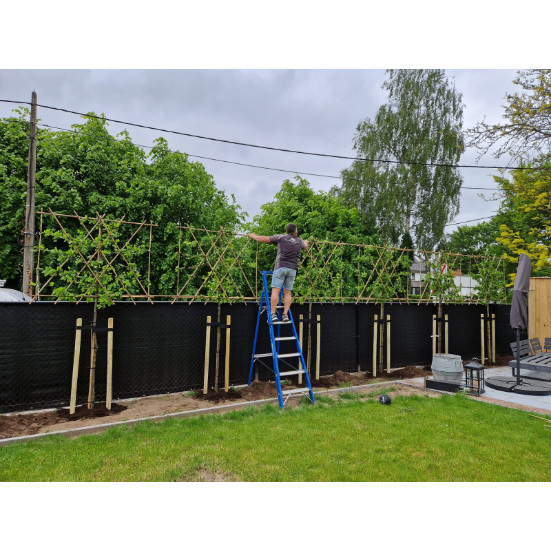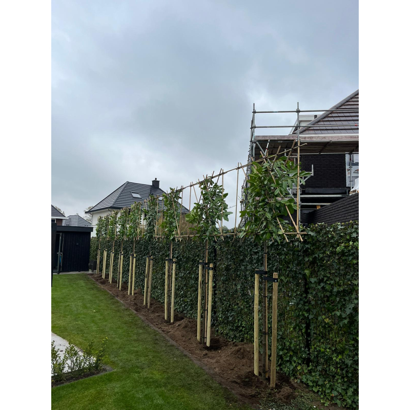 Wij bieden deze dienst aan bij de categorie leibomen. Door de leibomen onderling met elkaar te verbinden met bamboestokken komen de bomen in een mooie rechte lijn naast elkaar te staan. De bamboestokken en het bindmateriaal wordt meegeleverd, dat hoeft u niet nogmaals te bestellen. Bij het kopje formaat kunt u het aantal bomen selecteren.