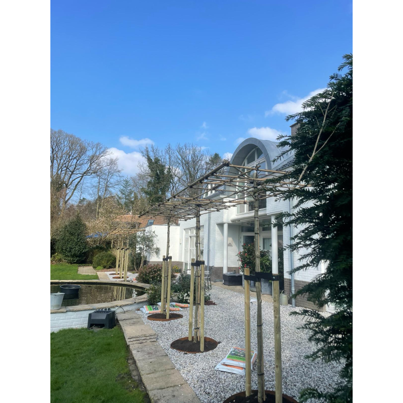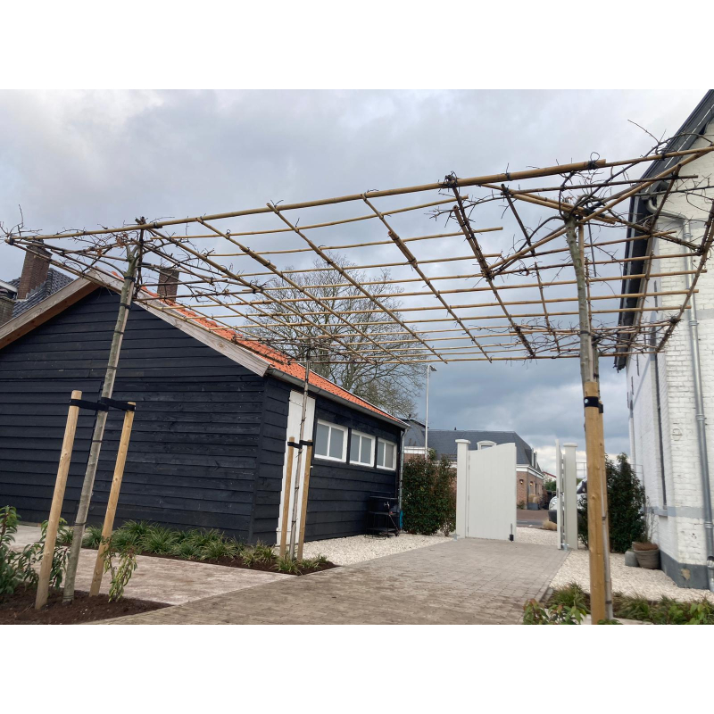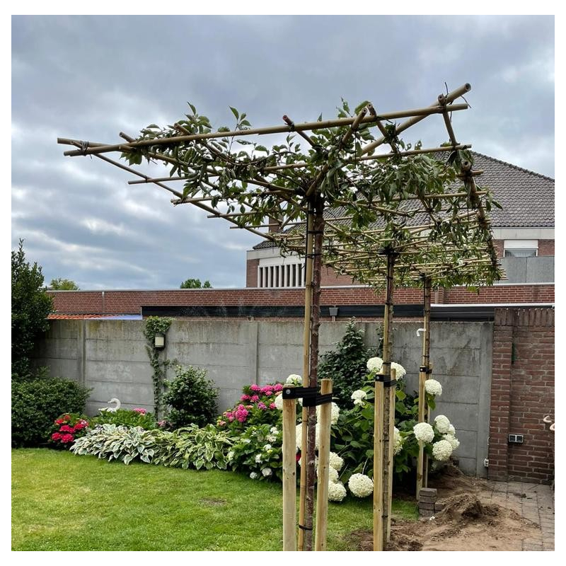 Wij verbinden de bomen tot maximaal 60cm door. Zo blijft het geheel goed stevig en groeit het rek binnen korte tijd dicht.