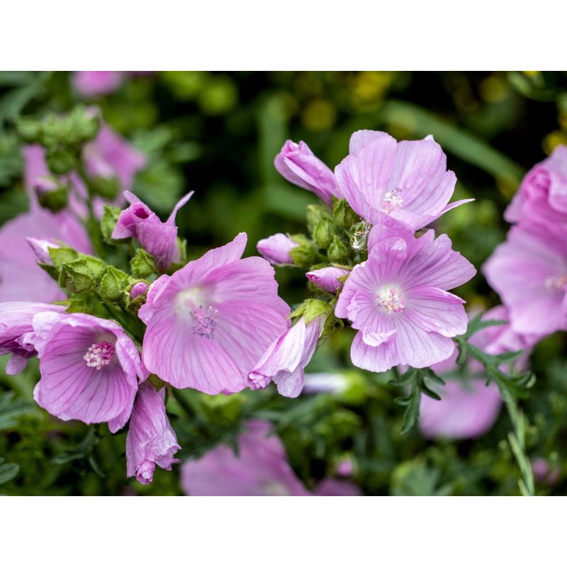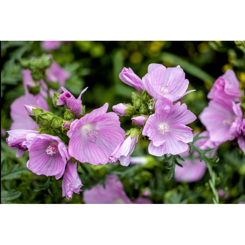 Malva moschata ‘Rosea’ (Muskuskaasjeskruid) vormt een sierlijke, bossige plant met diep ingesneden, frisgroene bladeren die een subtiele muskusgeur verspreiden. In de zomer verschijnen talloze bloemen met zachte tot helderroze tinten. Hoewel de bloei per bloem niet lang aanhoudt, verschijnen er voortdurend nieuwe knoppen, waardoor de plant lange tijd kleur geeft aan de border.