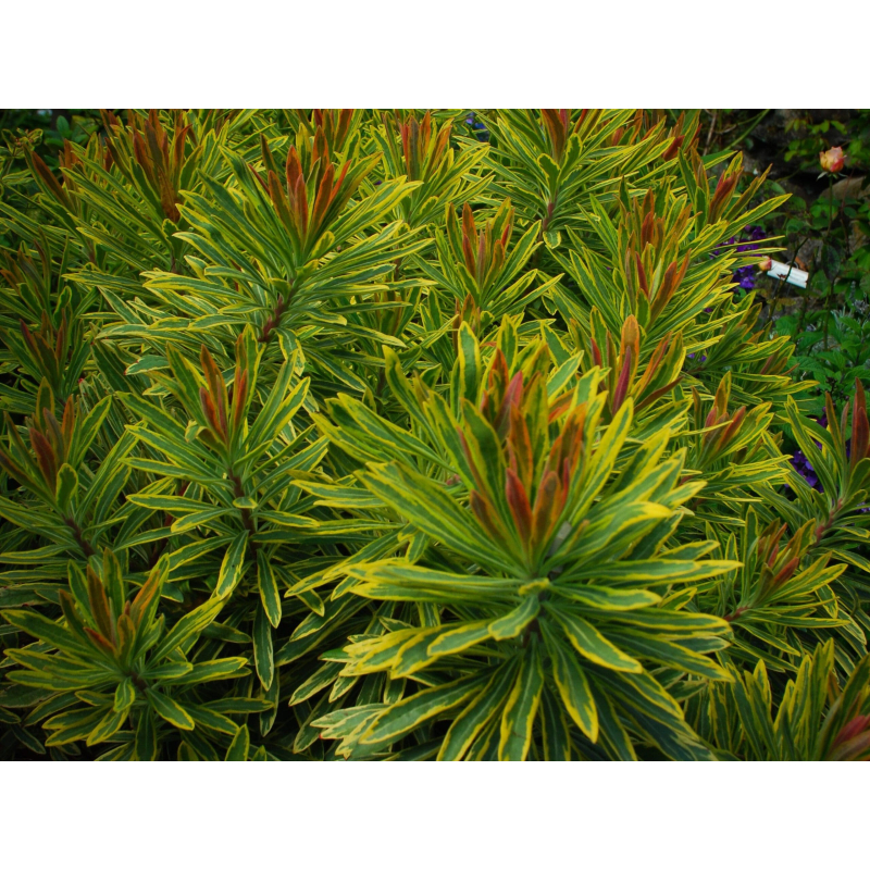 Euphorbia ‘Ascot Rainbow’ is een echte blikvanger voor de tuin. Het sierlijke, bontgekleurde blad toont een speels palet van groen, zachtgeel en warme roodtonen, waardoor de plant het hele jaar door een stijlvolle uitstraling heeft. In het voorjaar trakteert deze wolfsmelk je op frisse, limoengroene bloei met een vleugje roze – een subtiele maar opvallende combinatie die elke border opfleurt.