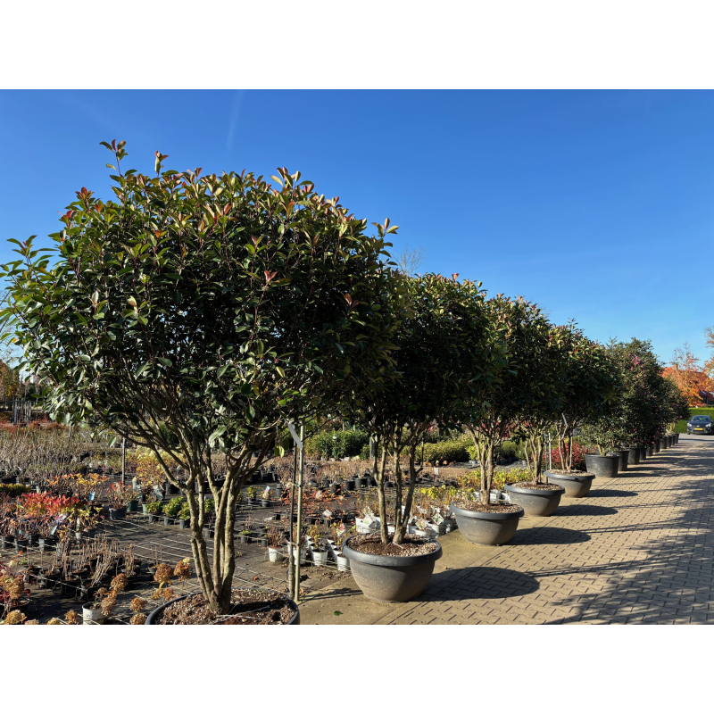 De Photinia fraseri Red Robin Meerstammig (Glansmispel) is een prachtige groenblijvende meerstam. In het voorjaar loopt de Photinia helder purperrood uit en lijkt het of de boom in een rode gloed staat. Daarnaast krijgt de Photinia in het voorjaar, mits niet te laat gesnoeid, grote crémewitte schermbloemen, gevolgd door donkerrode bessen. In de winter blijft de Bolphotinia prachtig glanzend groen, zodat de boom jaarrond sierwaarde heeft. De Bolphotinia staat het liefst op een beschutte plaats.
