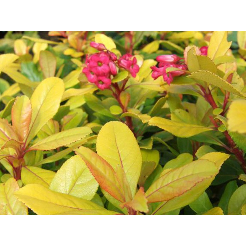 Wat deze Escallonia extra bijzonder maakt, is het kleine glanzende blad in een warme goudegele tint. Van juni tot en met augustus verschijnen hier tussen sierlijke, roze bloemetjes die heerlijke geuren en volop bijen en vlinders aantrekken. Onder gunstige omstandigheden kan de plant in de nazomer nog een tweede bloei laten zien.