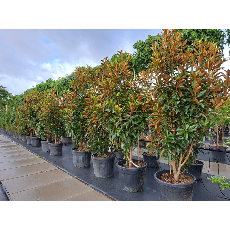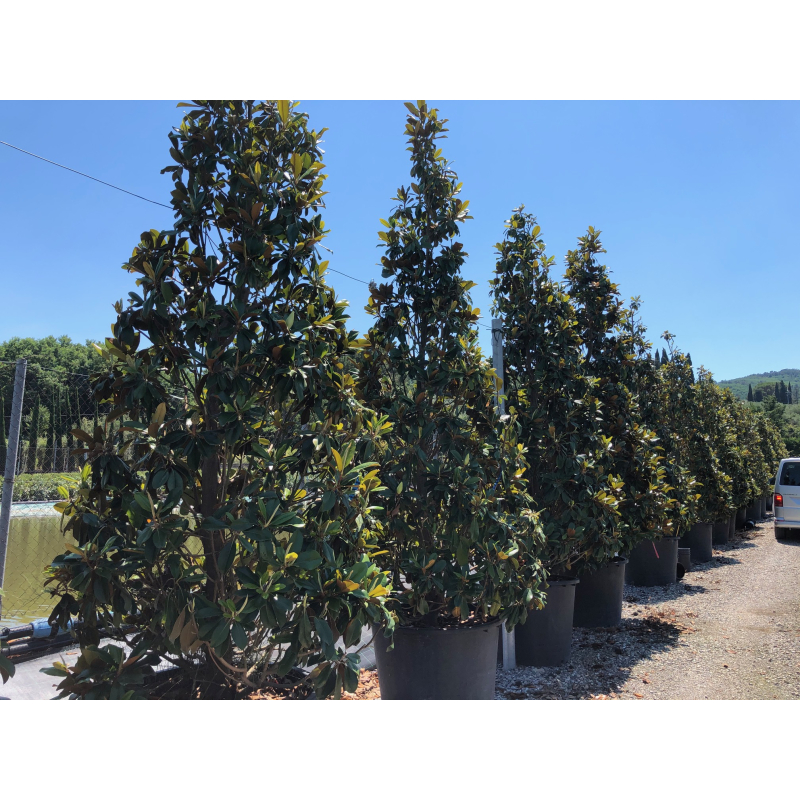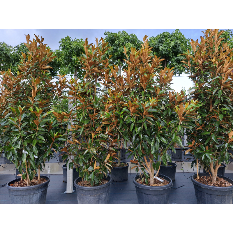 De Magnolia Grandiflora is als struik leverbaar. Als deze van onderaf blad heeft, wordt dit een beveerde struik genoemd. De struik is 'op te knippen', waardoor er eerst stammen zichtbaar zijn. De Magnolia wordt dan meerstammige struik/boom genoemd.