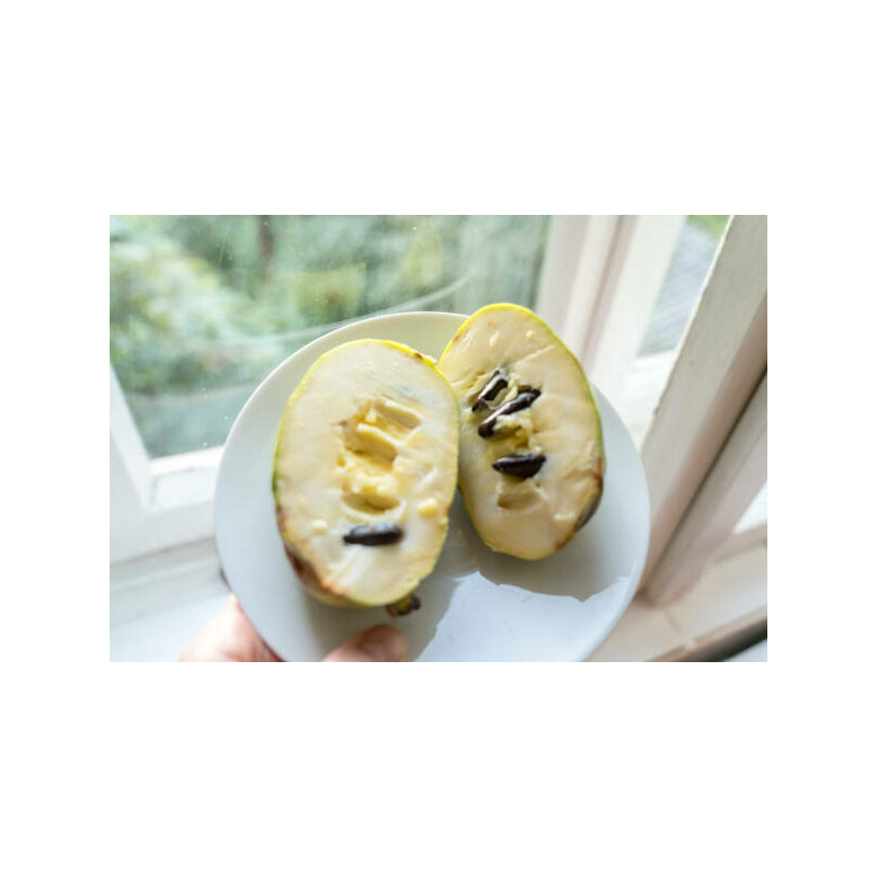 In het voorjaar verschijnen opvallende purperen bloemen, gevolgd door de langwerpige vruchten. De vruchten hebben zacht, geel vruchtvlees met een heerlijke smaak die doet denken aan een mix van banaan en mango. De vruchten zitten boordevol vitamine C en kunnen in September geoogst worden. de Pawpaw boom is zelfbestuivend en geeft dus altijd vrucht.