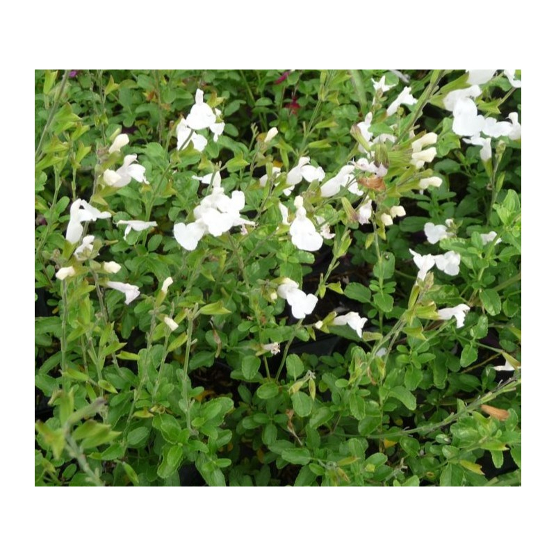 Salvia microphylla ‘Gletsjer’, ook wel kleine salie of bergsalie genoemd, is een elegante en bijzonder langbloeiende sierplant met een frisse, heldere uitstraling. Deze cultivar valt direct op door zijn zuiver witte bloemen, die prachtig afsteken tegen het zachtgroene, aromatische blad. Wanneer je het blad wrijft, komt een aangename kruidige geur vrij.
